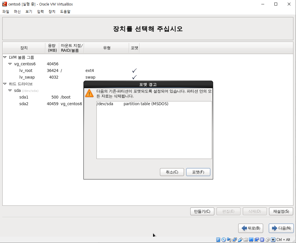 7.현재 OS를 설치할 디스크 포맷이 필요하므로 '예,모든 데이터를 삭제합니다'선택